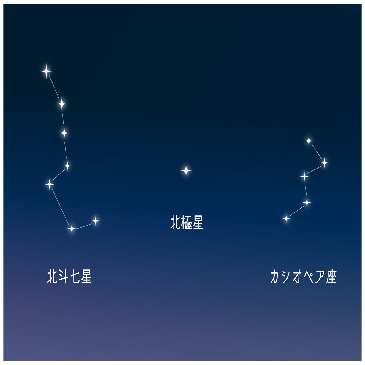 「方知らす」つまり、北の方向を知らせてくれる星という意味です。北極星を探すのに北斗七星がよく知られていますが、カシオペアからも見つけることができます。