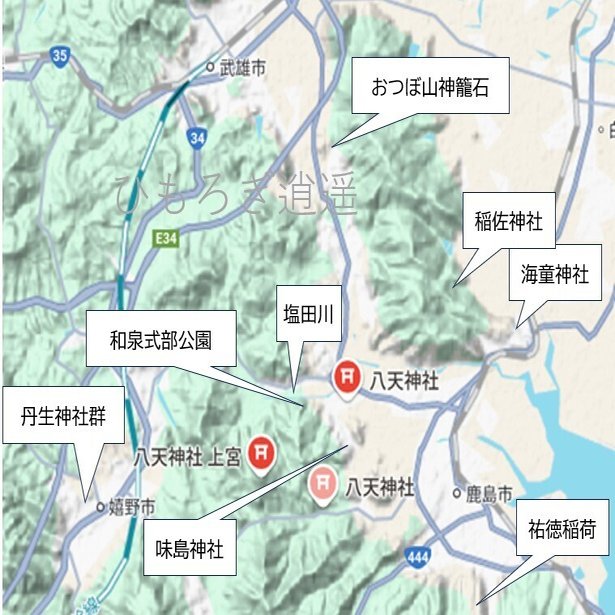 今回はその現地に行くわけですが、調べていくと、その周辺には、おつぼ山神籠石があり、火の神を祀る八天神社、水の女神を祀る丹生神社、三大稲荷社の祐徳稲荷(ゆうとく)がありました。
