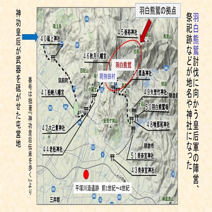 この地図は『日本書紀』に書かれた羽白熊鷲攻めのルートと関連する神社群を記したものです。